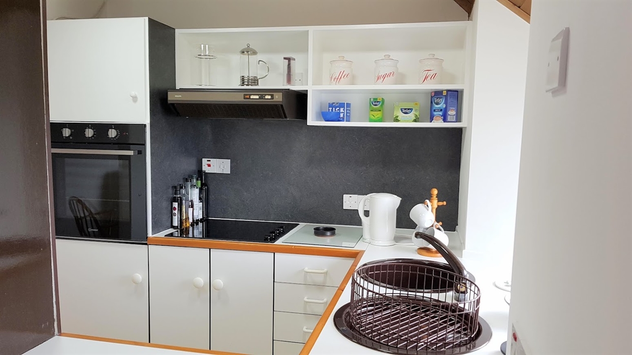 The kitchen is well equipped and is stocked with a selection of essential items, such as instant & ground coffee, tea, sugar, olive oil, vinegar, salt & pepper.