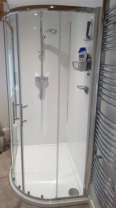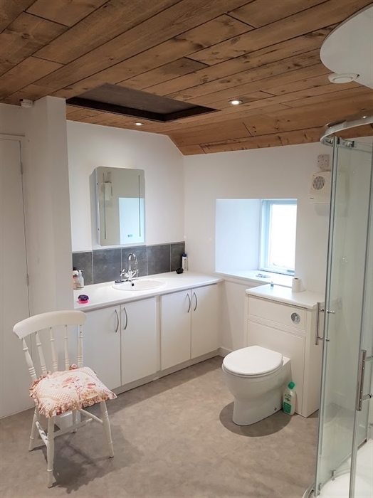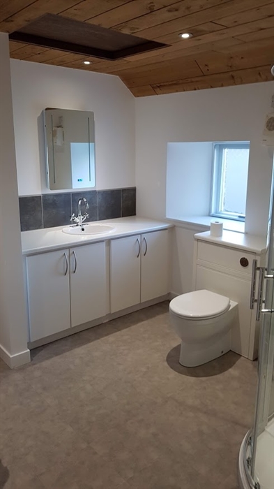 - Bathroom with shower over the bath, WC and wash-hand basin