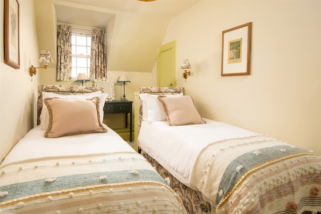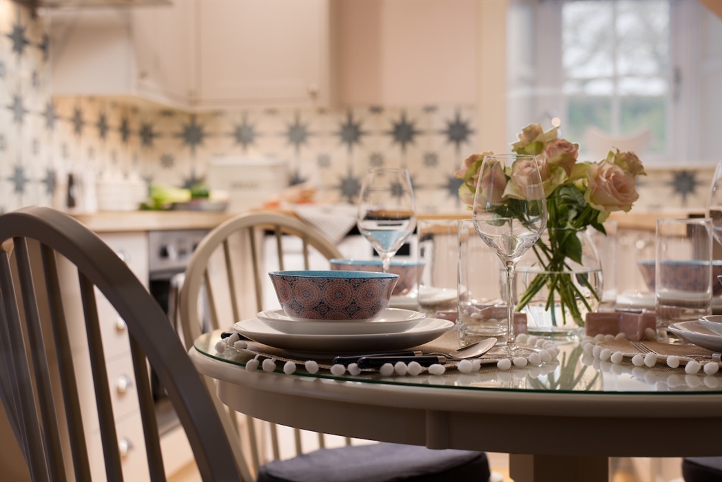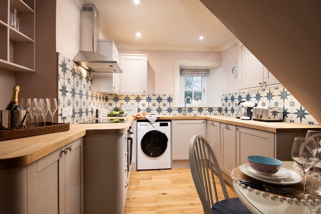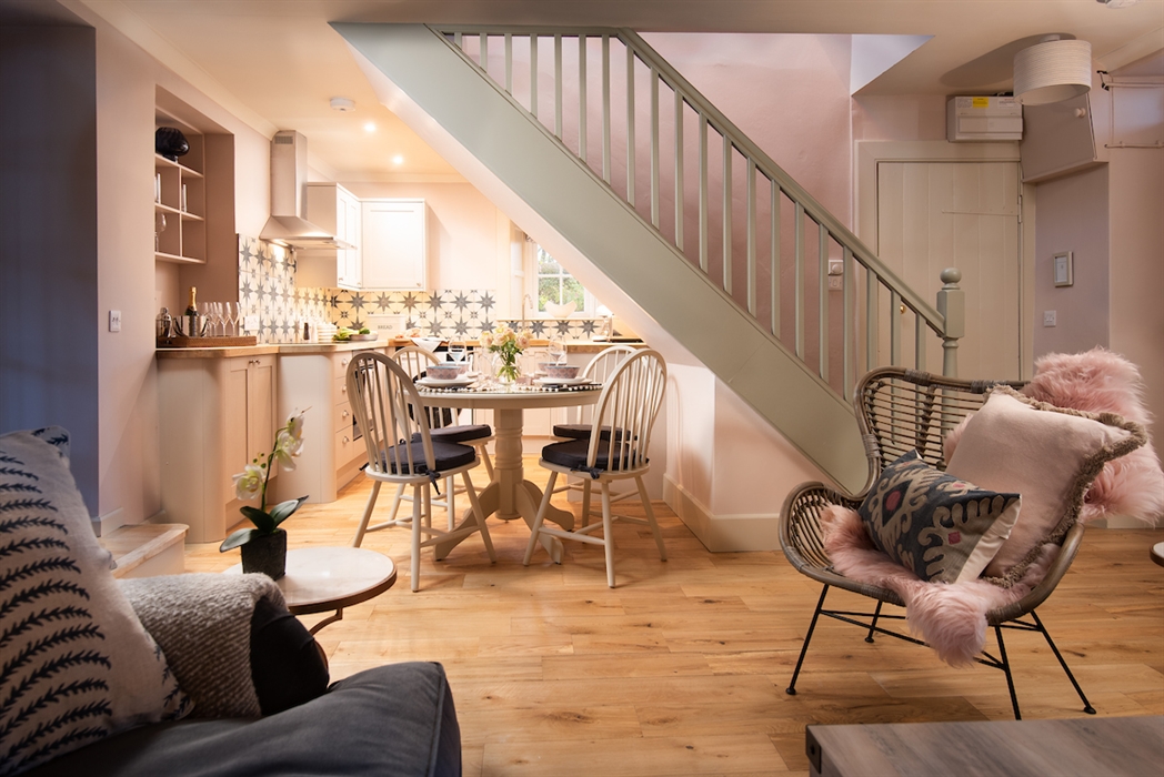 An open plan sitting room / kitchen with an inviting fireplace and plush velvet sofas generously strewn with Oka cushions forms the heart of this homely holiday cottage. The small kitchen, which is tucked away behind the stairs and a dining room table for four, is well equipped and features Bert & May tiles that artfully mirror the patterned rug in the living area.