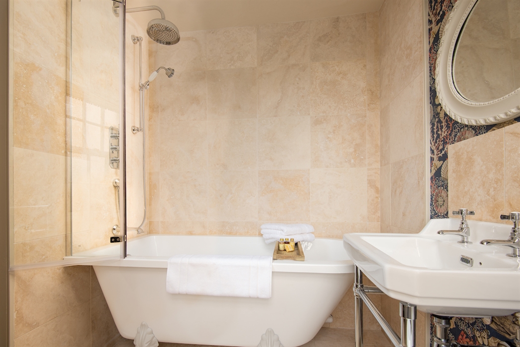 Bathroom with claw-foot bath and overhead shower with rainforest head and separate mixer, heated towel rail, basin and WC.