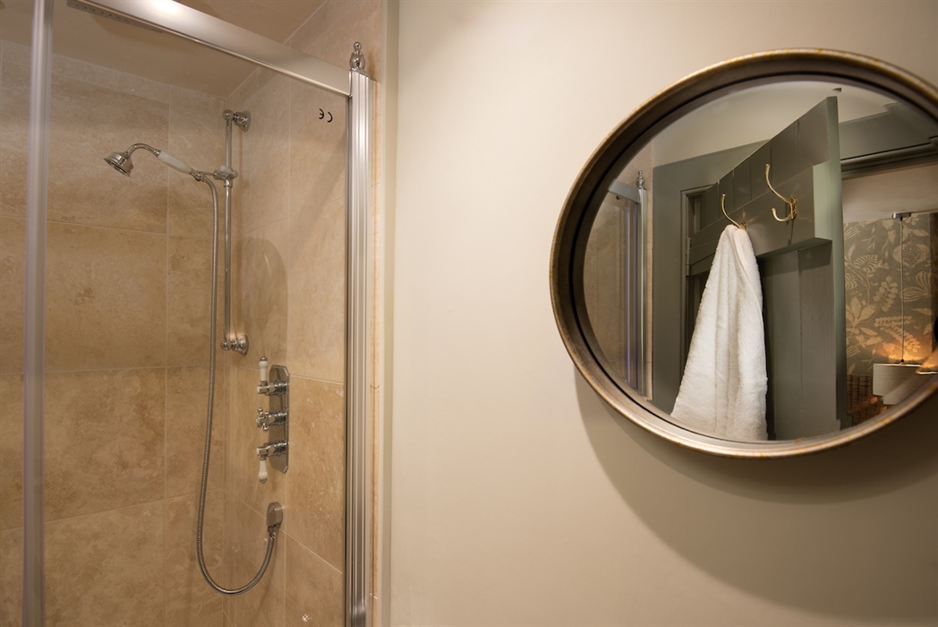En suite shower room with walk-in shower, heated towel rail, basin and WC.