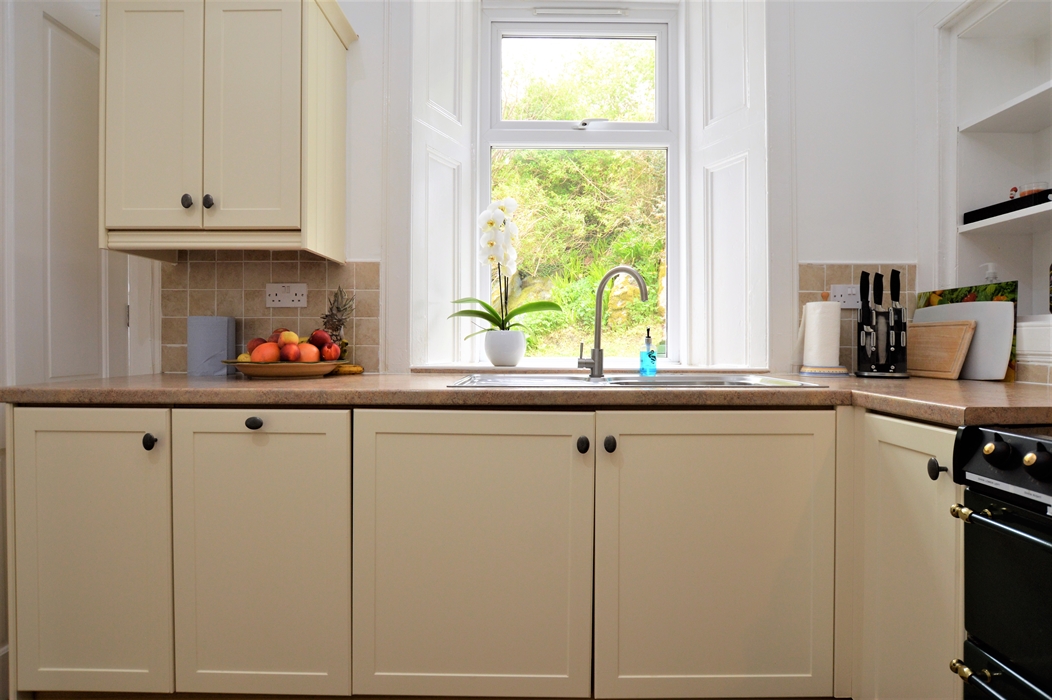 The spacious kitchen is well equipped and features a Range cooker with 6 ring gas hob, fridge and table top freezer, coffee machine and dishwasher. For convenience there is a combo washing machine and dryer.