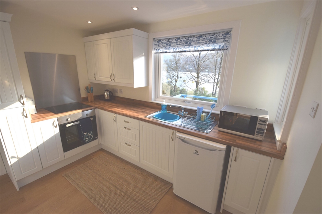 - Kitchen – electric hob, oven, domestic fridge with small freezer compartment, microwave, toaster, kettle