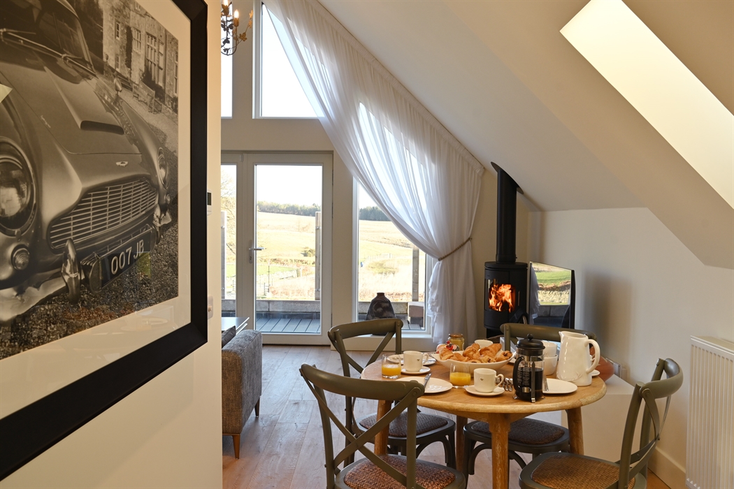 The open-plan living area is upstairs, on the first floor, and has wonderful views over the pretty Perthshire countryside. Patio doors lead out to a wooden terrace with two short flights of stairs to ground level. The stylish kitchen is fully equipped with all modern conveniences including a double oven and an induction hob. There’s also a dining table for four and comfortable sofas for relaxing and watching TV.