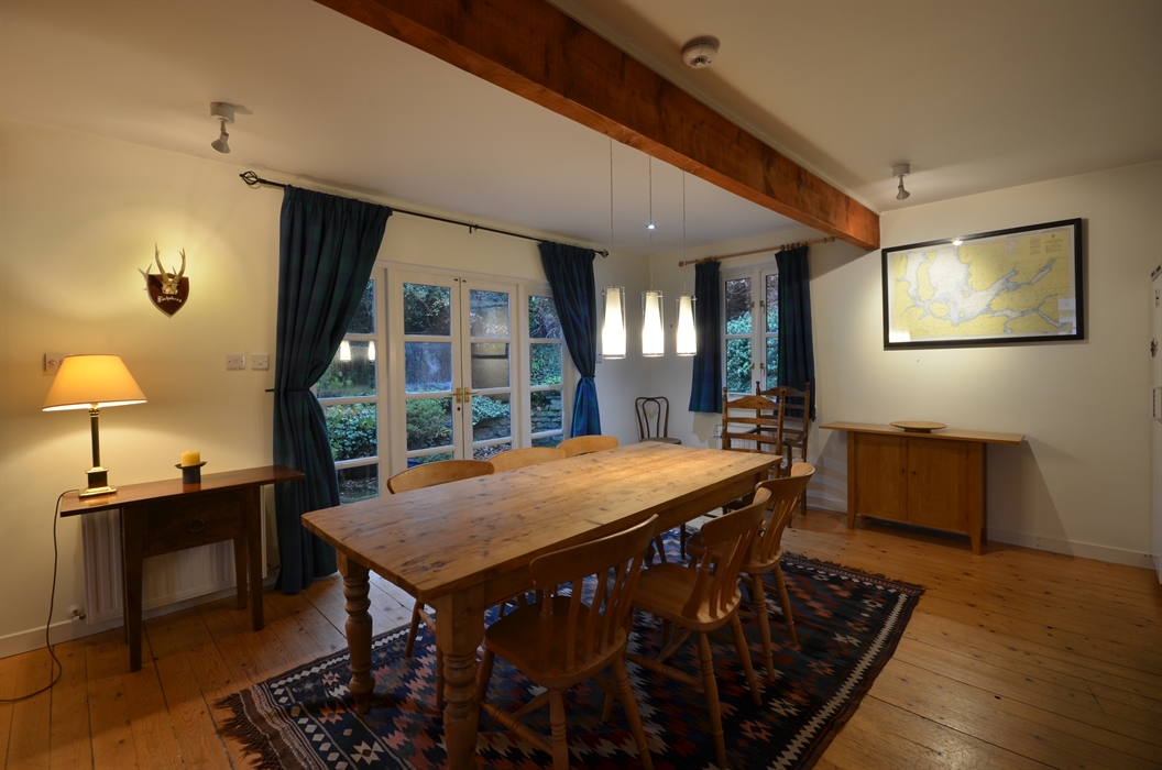 The garden is full of mature plants and trees and a little path leads up to a raised garden room that has cosy seating from which to admire the view out over the houses to Loch Carron and the impressive mountains beyond.