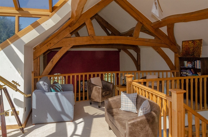 A Franklin wood burning stove dominates a large open fireplace as the 7 metre high vaulted cathedral ceiling, with its traditional oak beam trusses extends high above the lounge and continues over the staircase and first floor mezzanine gallery. The TV entertainment offers access to Amazon Prime TV (Fire stick) including TNT sports via Discovery+ channel