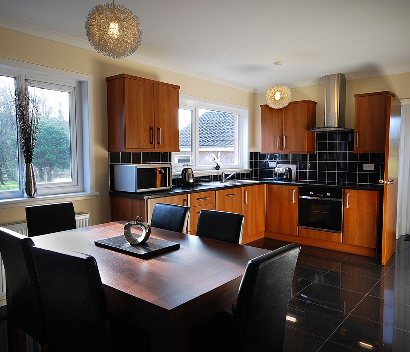 - Enjoy the large fully equipped dinning kitchen that works well as a family room with wall mounted flat screen TV, hob, oven, microwave, fridge/freezer, kettle, toaster, pots, pan, cutlery, crockery and utensils to ensure a comfortable home from home cooking and dining experience.