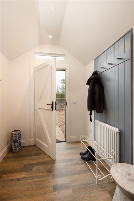 Access into an inner porch with hanging rail. Ideal for the storage of boots and shoes.