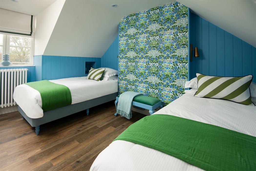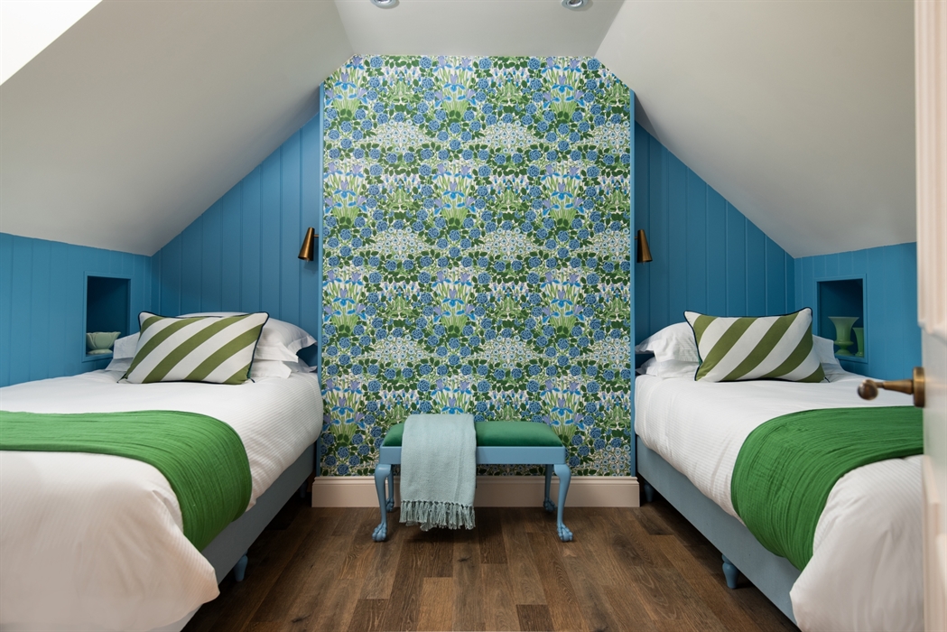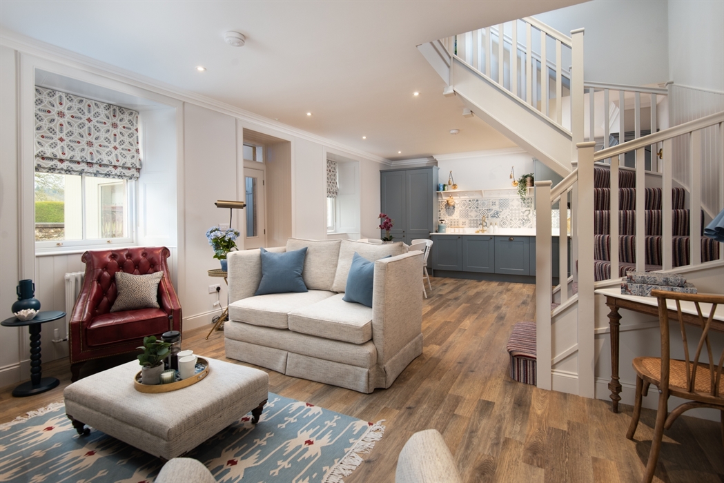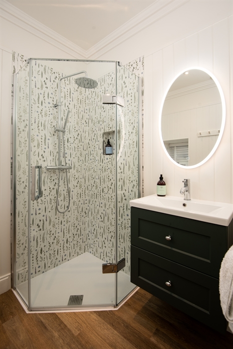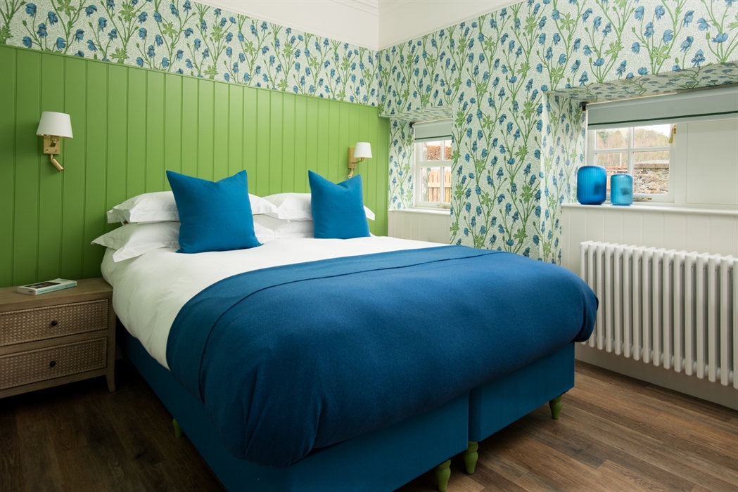 The first bedroom is situated on the ground floor, decorated with leaf green panelling and floral-patterned wallpaper which reflect the flourishing gardens to be enjoyed at Kailzie. The ensuite bathroom next door is home to a shower decorated with botanical tiles and warming underfloor heating. The second bedroom lies up the staircase on the first floor with twin beds accompanied by sky blue panelling and a floral feature wall and benefits from the smart family bathroom which is located next door. With soft olive-green panelled walls, a spacious rainforest shower, and a contemporary freestanding bath, it’s the perfect place to unwind.
