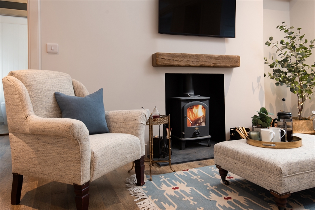 Sitting room area with double sofa, two armchairs, wood burning stove, wall-mounted Smart TV.