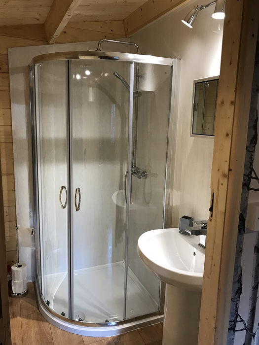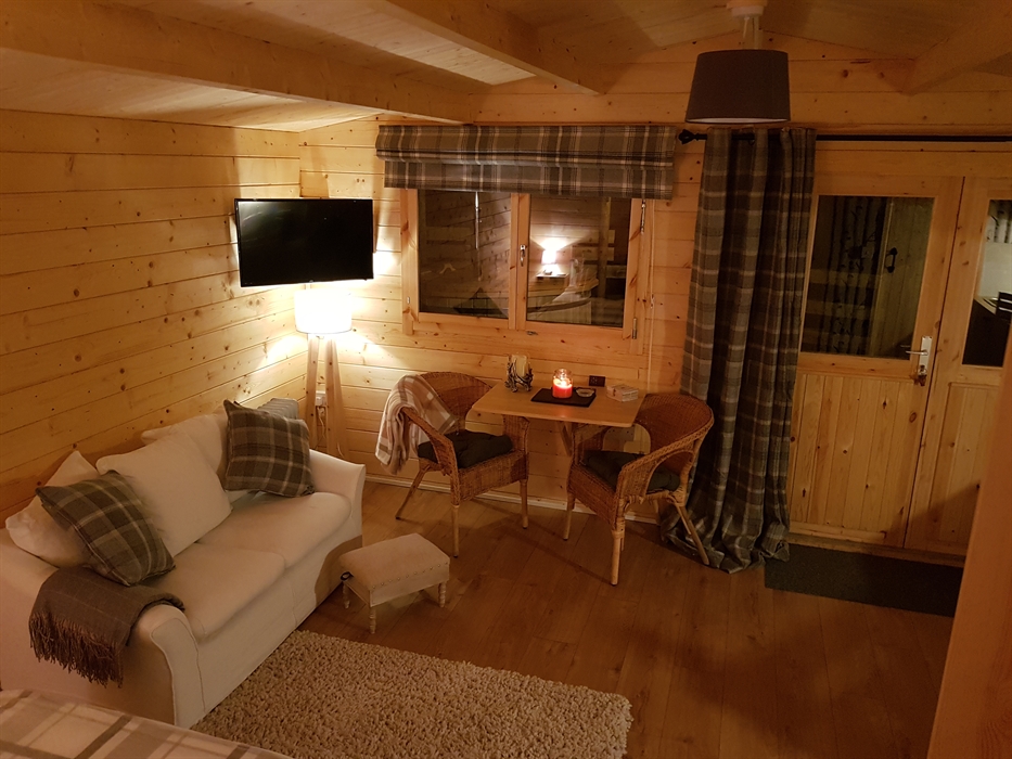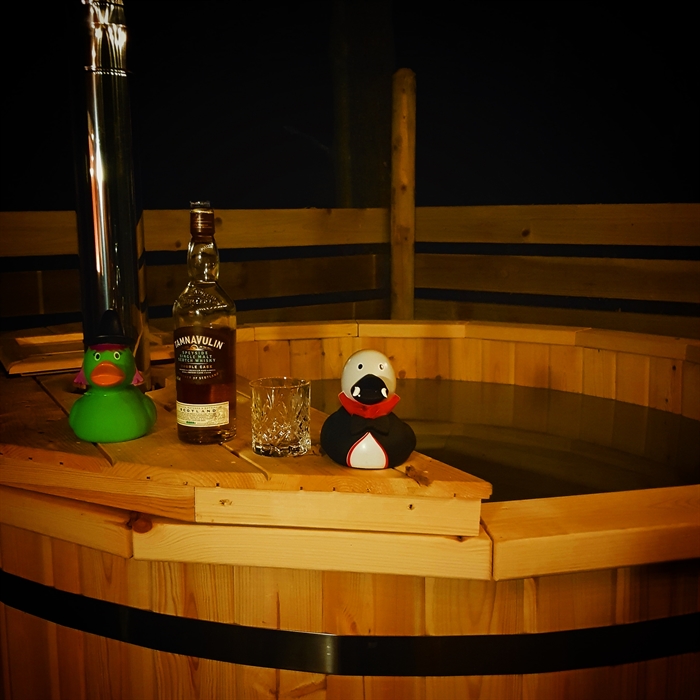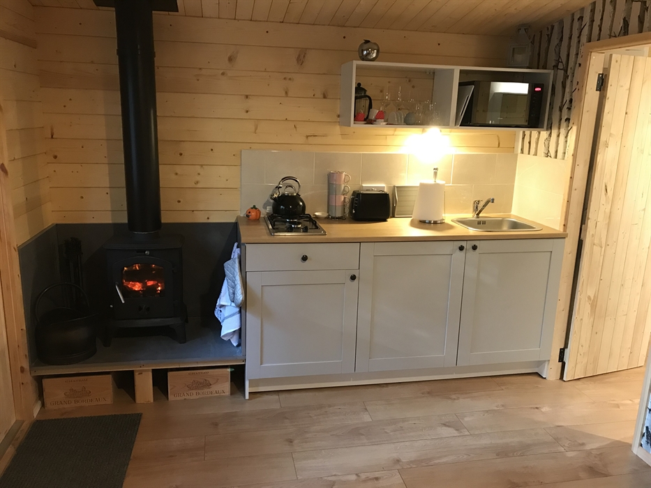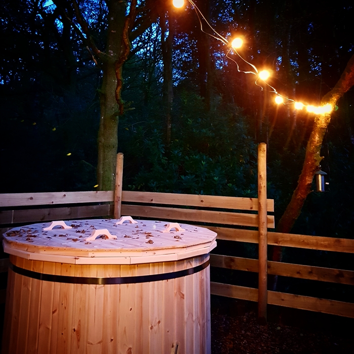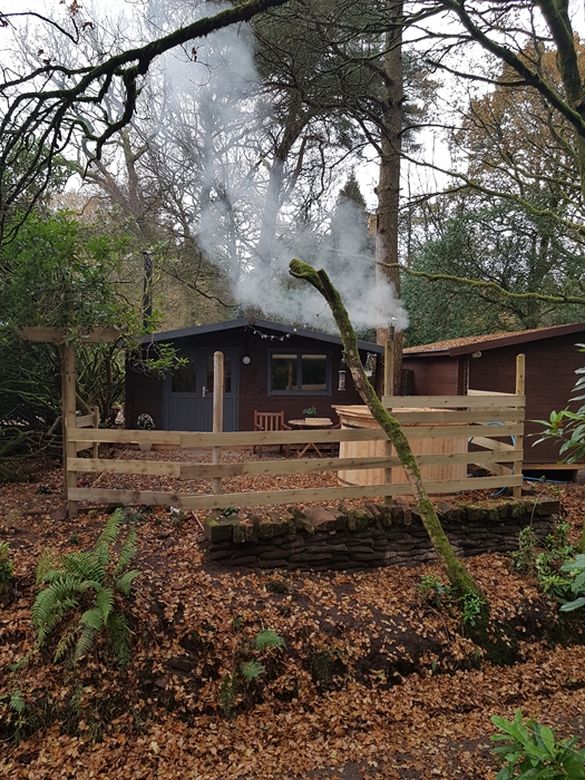 Luxury lodges with wood-fired hot tubs in a woodland setting.