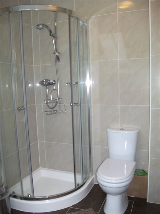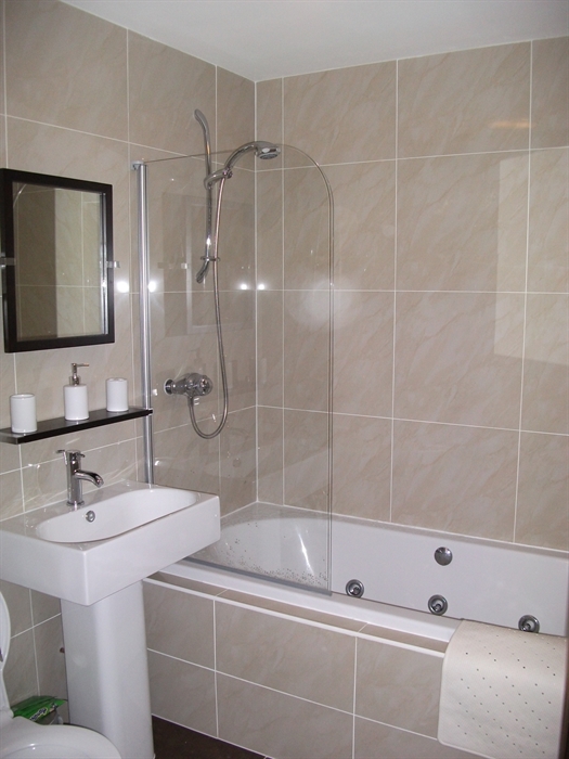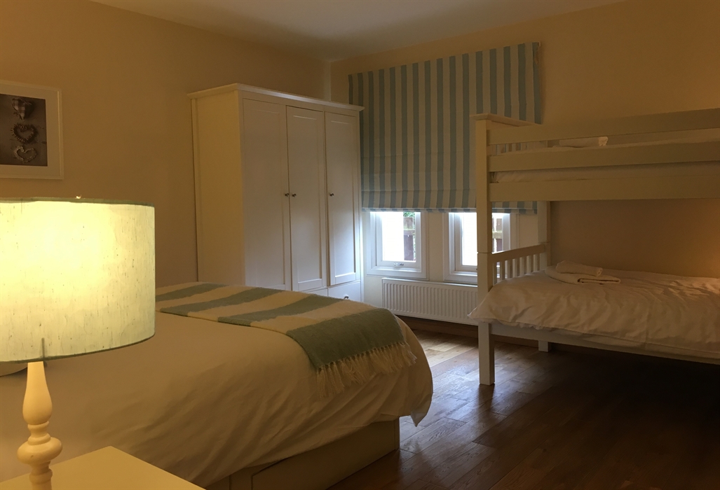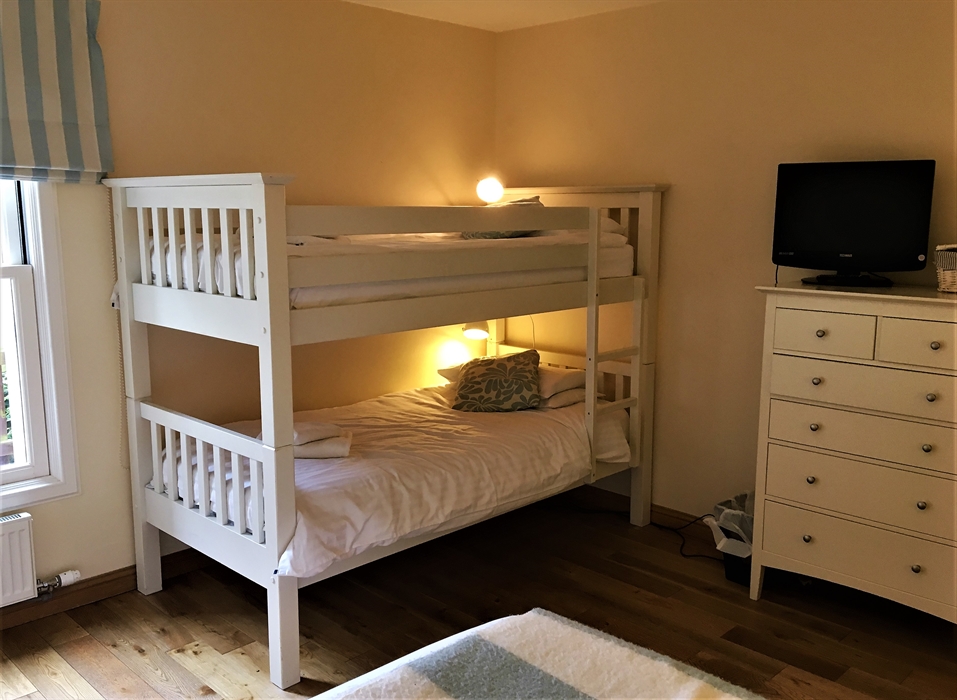 The spacious ground floor family bedroom has a king size double bed together with adult size bunk beds, triple wardrobes, a large chest of drawers and a TV/DVD player. Completing the ground floor is the family bathroom with jacuzzi bath and "mains" shower over the bath.