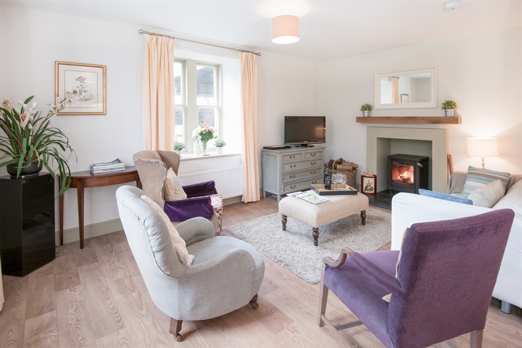 Sitting room with wood burning stove, TV with Freeview and DVD, French doors to the garden.