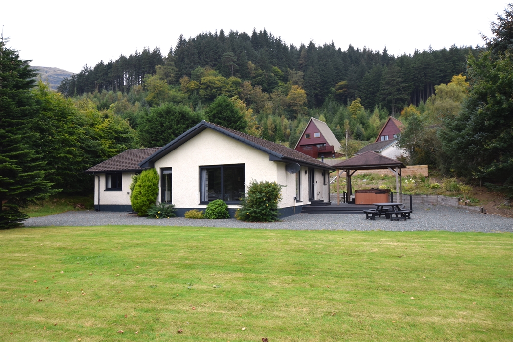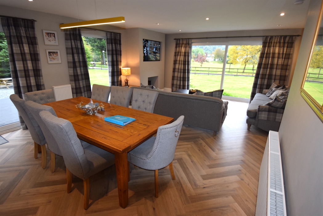 You will find a modern, open plan kitchen, dining and lounge with large windows that make the most of the fabulous surrounding views. There is a large lawned garden to the front, an elevated lawned garden at the rear and a deck to the side, with hot tub and sheltered gazebo making it ideal for all weathers. Parking for 3 cars. The holiday home feels spacious.