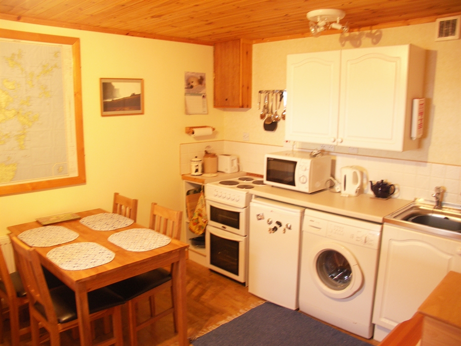 The flat has its own entrance and is located at the end of a private road with ample parking. Inside, the accommodation is cosy and welcoming. The fitted dining-kitchen includes pine dresser, electric cooker, fridge, and washing machine. The pine panelled bathroom has a three piece suite, an electric shower over the bath and a heated towel rail. The bedroom includes a double bed with electric blanket, bedside cupboards and wardrobe.