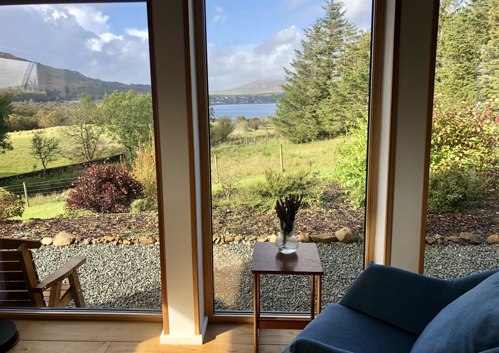 Bedroom 1 - The ground floor offers access to a double bedroom with jumbo window and stunning Cuillin mountain range vistas. Waking up with this view is like no other and you can relax in the super luxurious bedding and take it all in.