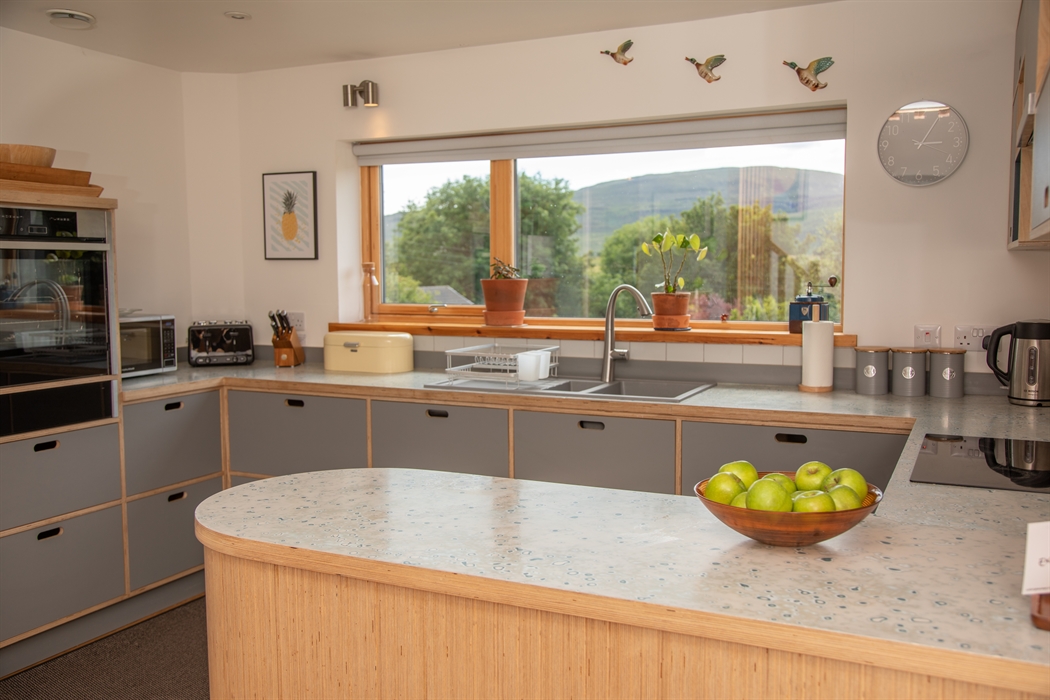 The stunning open plan ground floor living and dining area is well furnished with a comfy sofa and armchairs where you can gaze out of the floor to ceiling windows to Loch Portree and watch the tide drift in and out, whilst the fabulous modern wood burner keeps you cosy in the colder months. Once the sun has set, there is a large SMART TV with Sky TV and a Bluetooth speaker for music.