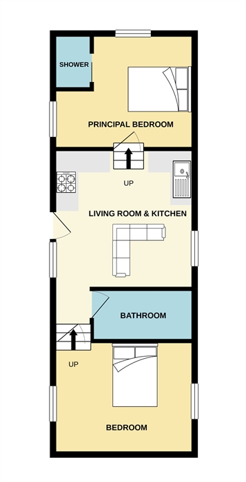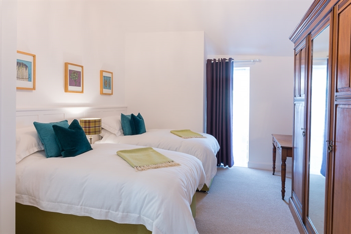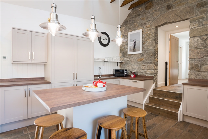 Accommodation for 4 with a small slope to Entrance Hall; open plan kitchen/sitting room/dining area with wood burning stove; flights of steps to 2 Super King size bedrooms (which can become twins - please let us know your preference at the time of booking), one with ensuite shower room & door to the patio; Bathroom.