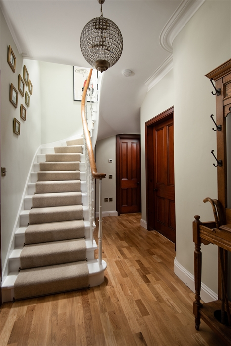 Access through the front door of the property into an inner hall, with free-standing coat rack and space for outdoor shoes and boots. Central staircase with the sitting room, ground floor bedroom and bathroom to the right of the main access hall, and the dining room and kitchen to the left.