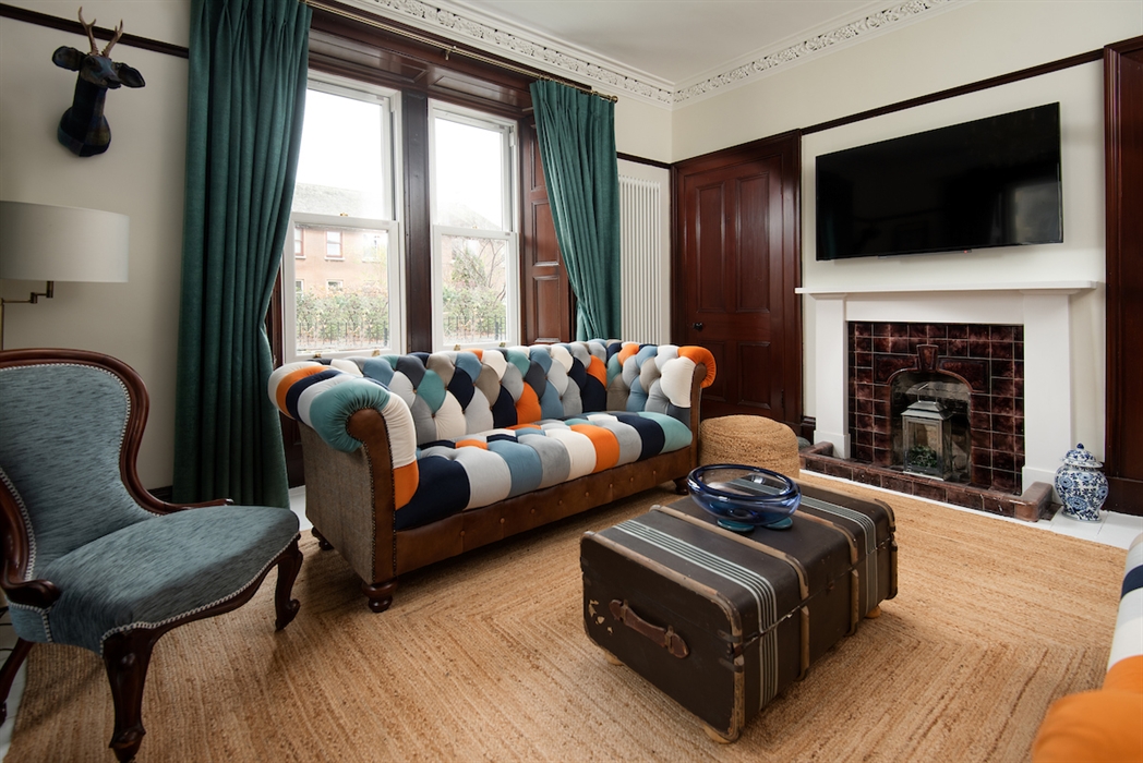 Sitting room with two large sofas, two occasional chairs, decorative fireplace, wall-mounted Smart TV. Double aspect windows with original working shutters.