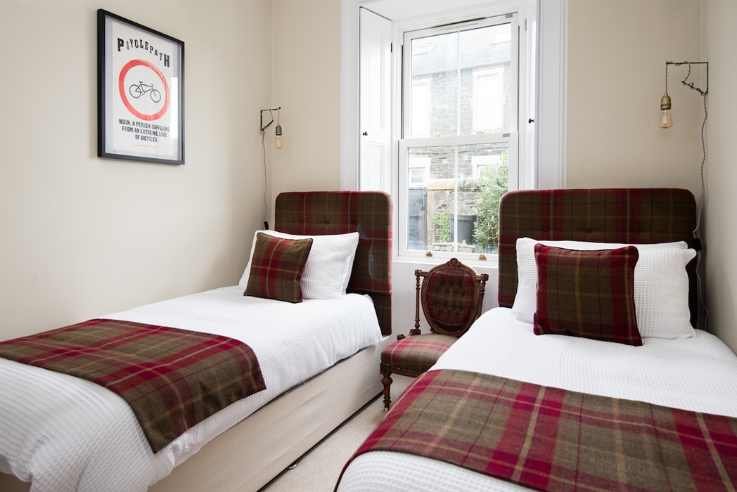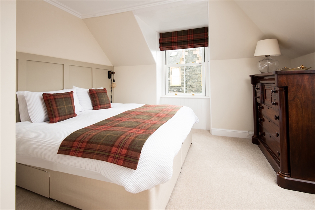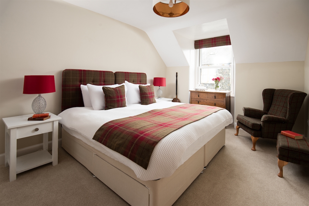 The first bedroom and contemporary bathroom are situated on the ground floor, with twin beds which can also be configured as a super king size bed. The further three bedrooms are all upstairs, each home to super king size beds which can also be configured as twins, as well as a family bathroom with a rainforest shower over a bath. Each room is decorated in individual colour palettes with warm woolen plaid throws and antique furniture.