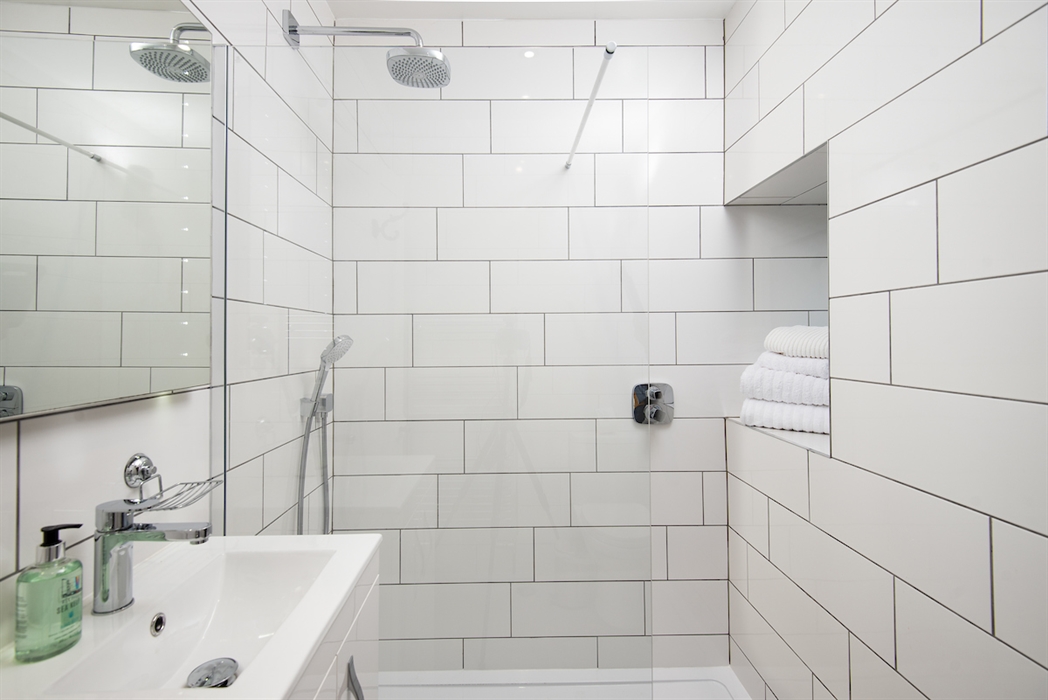Bathroom with large walk-in shower (rainforest head and separate mixer), heated towel rail, underfloor heating, basin and WC.