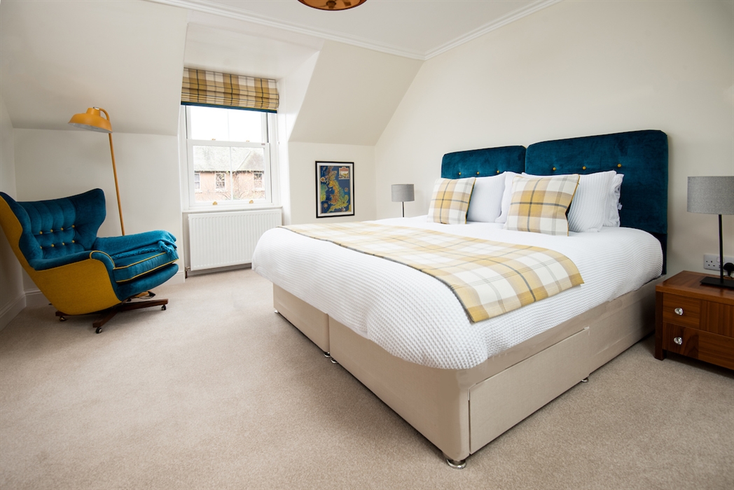Bedroom four - with super king bed with zip and link option which can be configured to a twin, side tables, chest of drawers, armchair and footstool, inner recess with large hanging rail and floor storage. This room is side facing.