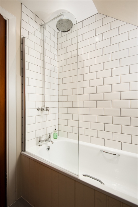 Family bathroom with bath and shower over (rainforest head), heated towel rail, underfloor heating, basin and WC.