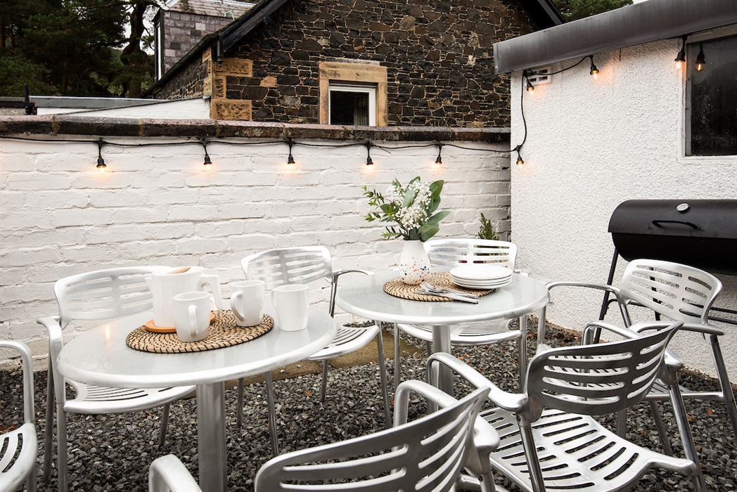 Rear courtyard with café tables and chairs for eight guests, festoon lights, barrel charcoal BBQ (charcoal not supplied).