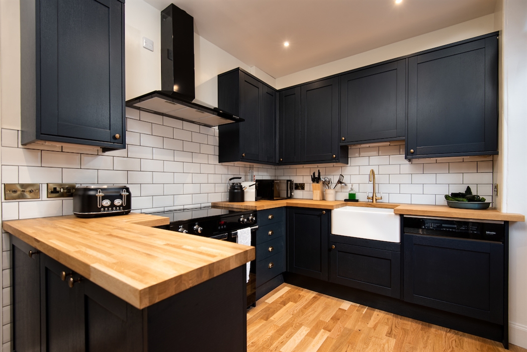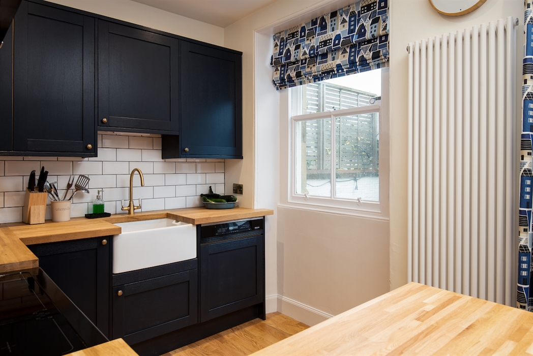 On entering the house into the inner hall, you’ll be met with the beautiful central staircase with ornate spindles, plenty of space for storing boots and coats, and a door through to the living room on the right. With plush and vibrant sofas bathed in light through large windows, it’s the ideal place to relax – whether that’s with a morning coffee or an evening cocktail. The formal dining room lies to the left of the central hall, where a hearth crafted from locally quarried stone and a large wooden table create the perfect atmosphere for a dinner party. You’ll find the kitchen at the rear of the house with doors that lead out to the courtyard, in addition to the welcoming features of a large range cooker and coffee machine.