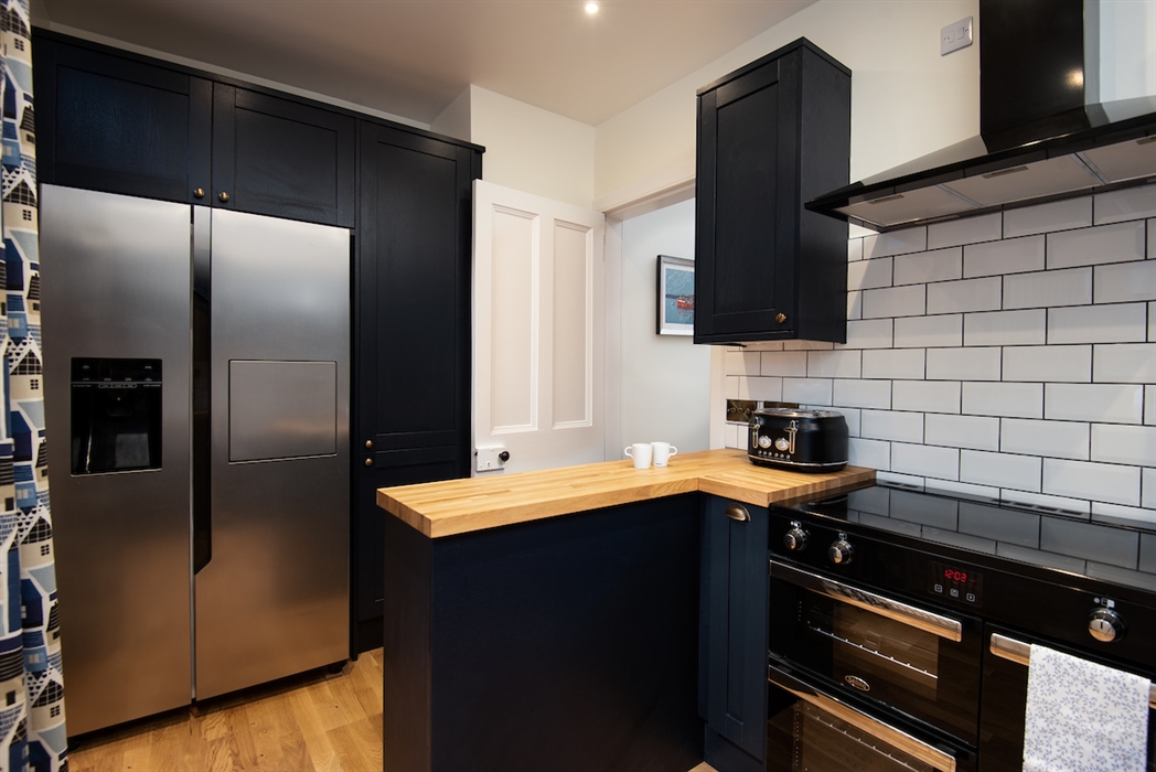 Kitchen with Belling range cooker with grill and double oven, 5 burner induction hob, large American style fridge/freezer which comprises a full-length fridge and a full-length freezer with ice machine and water dispenser, four-slice toaster, Nespresso Krups coffee maker (pod type), microwave, dishwasher. Door to the rear courtyard. There is a washing machine in the cupboard in the main access hallway. For outdoor kit, a further washing machine and dryer is available in the outside garage.