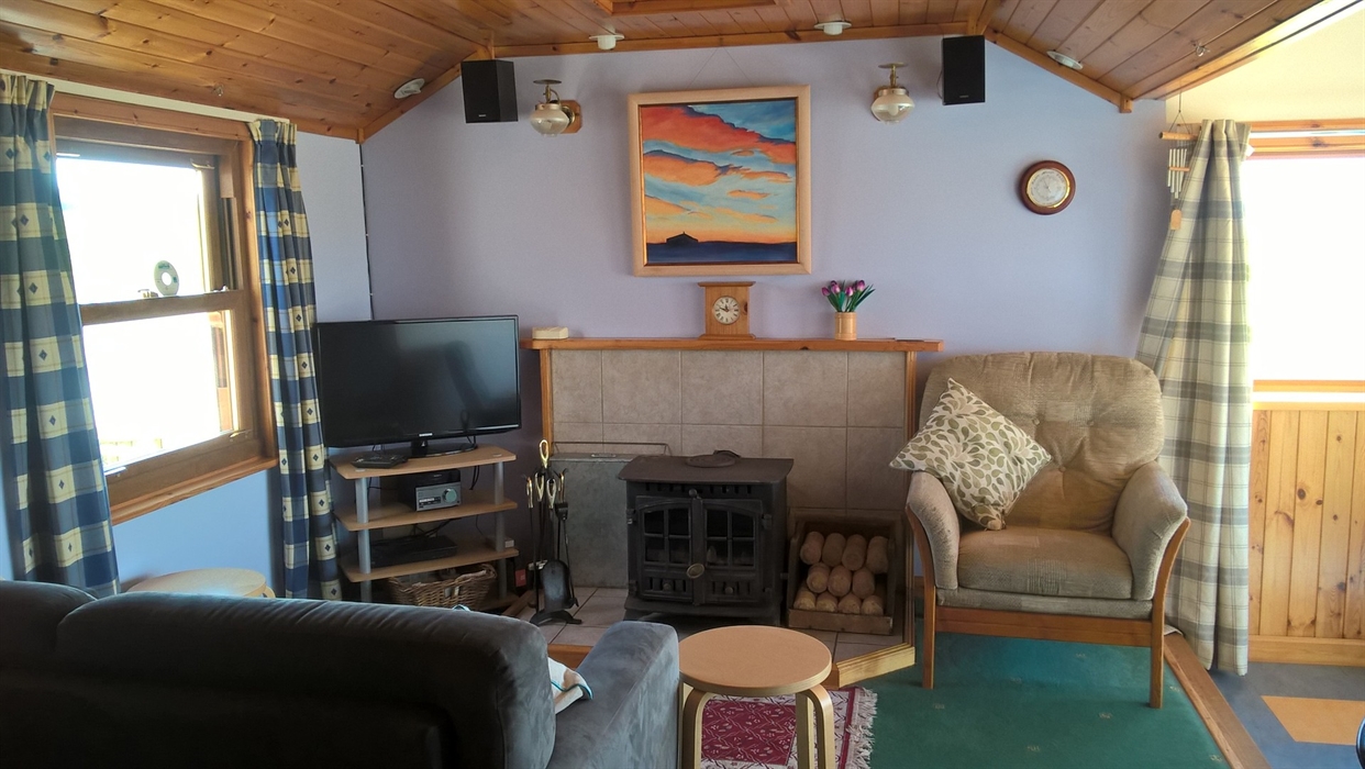 The cottage has a double and a single room, ideal for a couple or two friends, although an extra child's bed can be added for a family of four. It has a comfortable living room, well equipped kitchen and bathroom with large walk in shower. It also has a sunroom area with patio doors to the garden, the perfect location to watch the sunset or to view the extensive range of birds which frequent the small lochan and meadow areas in the adjacent fields.