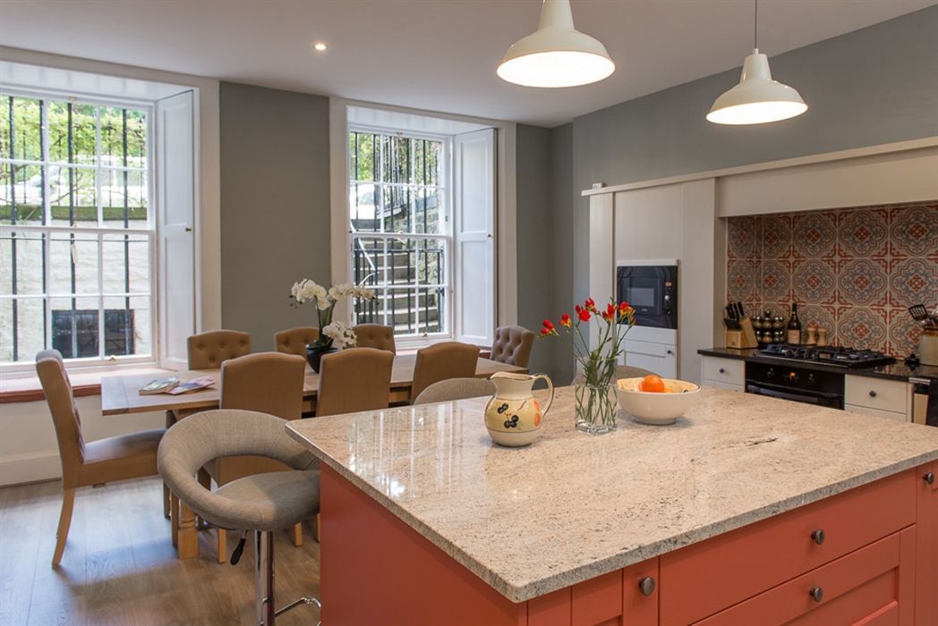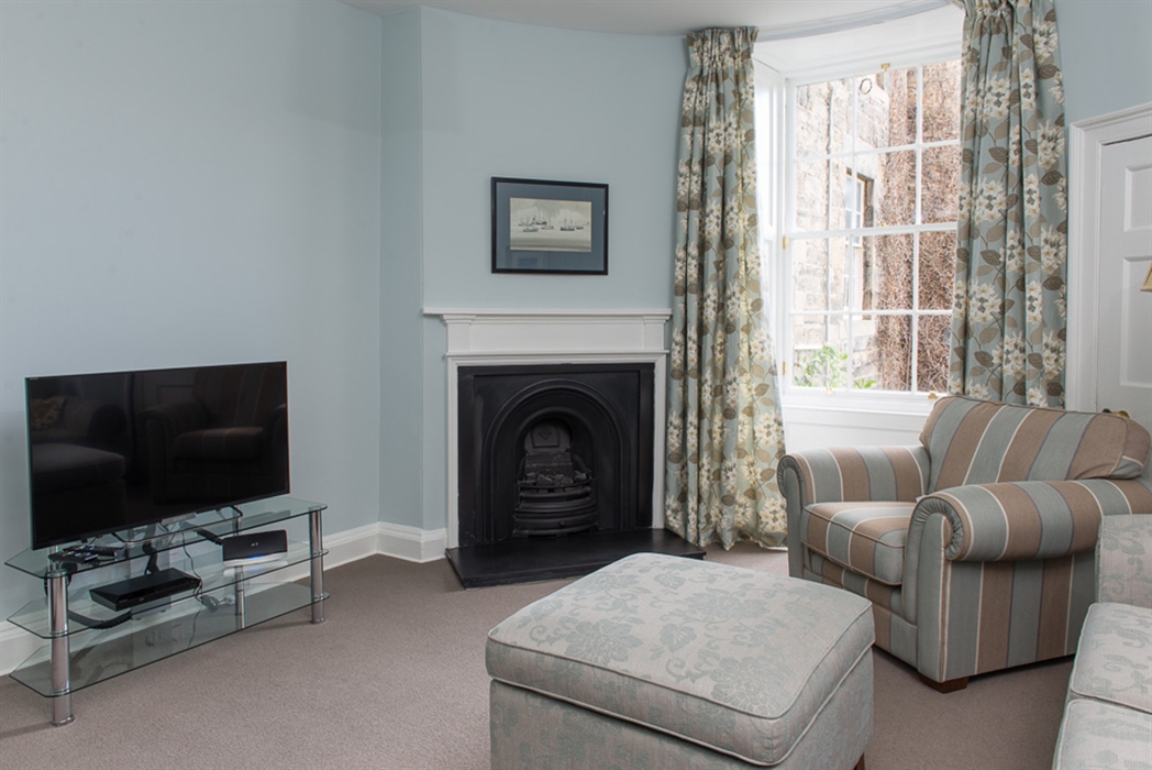 This fabulous luxury self-catering apartment spans two lower levels and is situated in Edinburgh’s New Town, a UNESCO World Heritage Site. The New Town is renowned as a paradigm of city planning and for its neo-classical and Georgian architecture dating from the 18th and 19th centuries. The property is within easy walking distance of all the amenities to be found on the area’s 2 most famous streets, George Street and Princes Street. Access is via the flight of stairs extending to the patio from the street above. There is no parking with this apartment, but parking mightn’t be necessary given its central location.