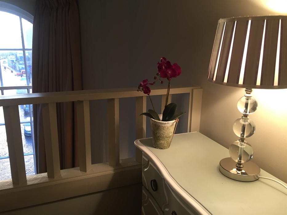 A beautiful arched window overlooking a cobbled Edinburgh street bathes the kitchen-living room and mezzanine twin bedroom in light. There is a lift.