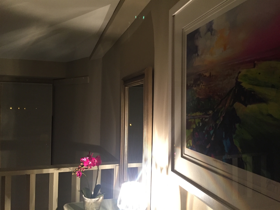 A large arch window bathes the sitting room in natural light. A comfortable Laura Ashley sofa and leather recliners for toal relaxation. Dining table and chairs. Sitting room kitchen and dining area all open plan.