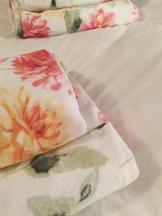 Bath room adjacent to the twin bed room room, with bath, hand basin, wc, bath mat and towels.
