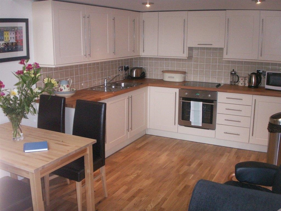 A well equipped kitchen with electric cooker, microwave, fridge, washing machine and tumble drier.Fitted kitchen, Royal Doulton dinner service, iron and board.