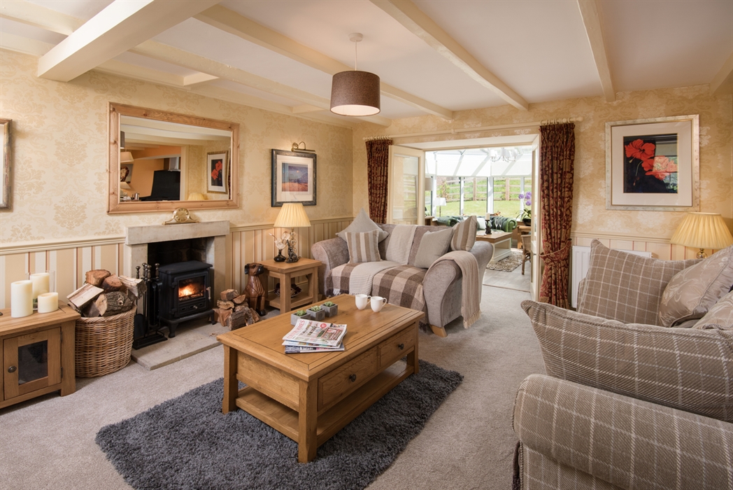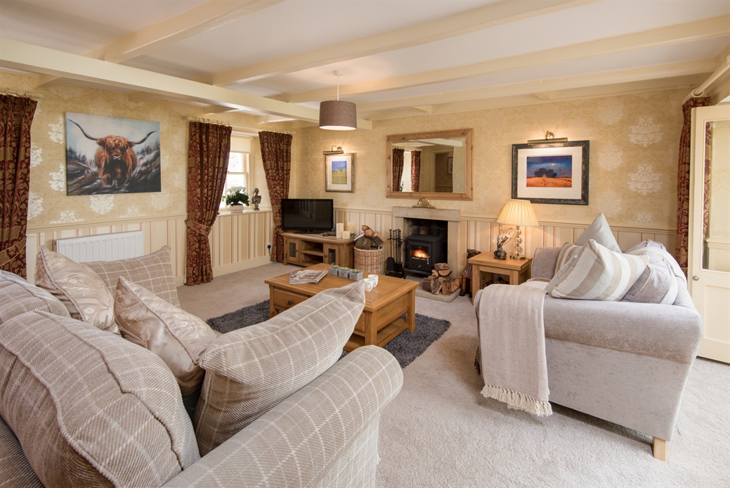 Sitting room with two large double sofas set around a wood burning stove with logs supplied. Technology includes a flat screen TV with integrated DVD. A selection of books, games and DVDs are provided.