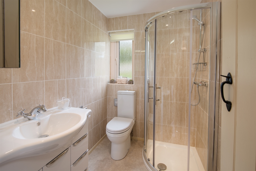 Bathroom with shower unit, heated towel rail, basin and WC.