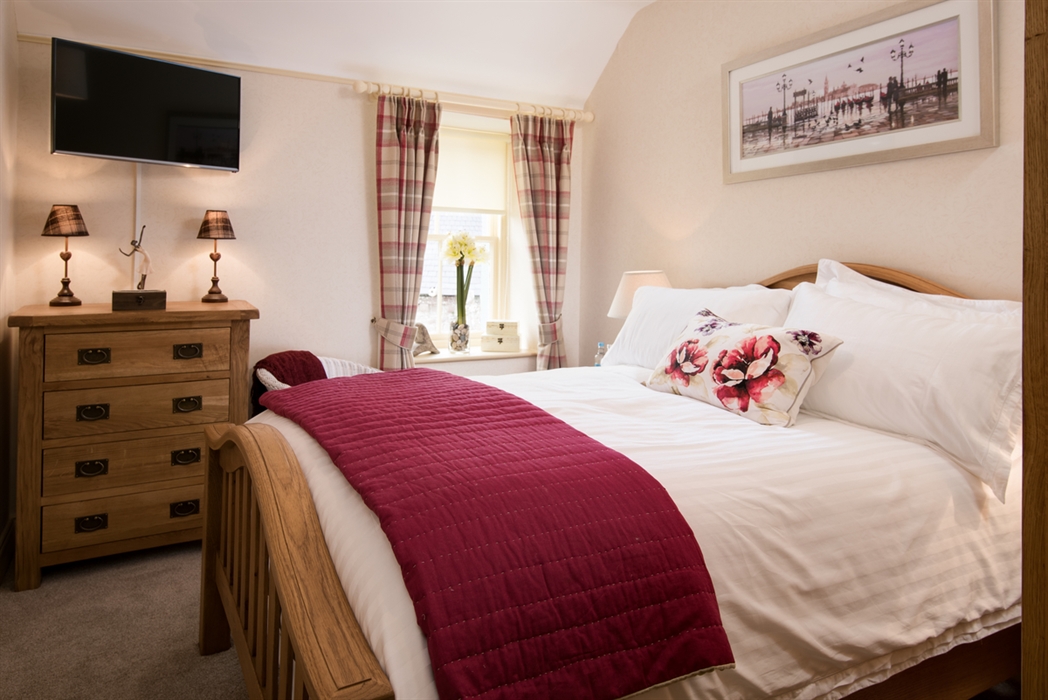 Bedroom one with 4’6” double bed, side tables, wardrobe, chest of drawers, and flat screen TV.