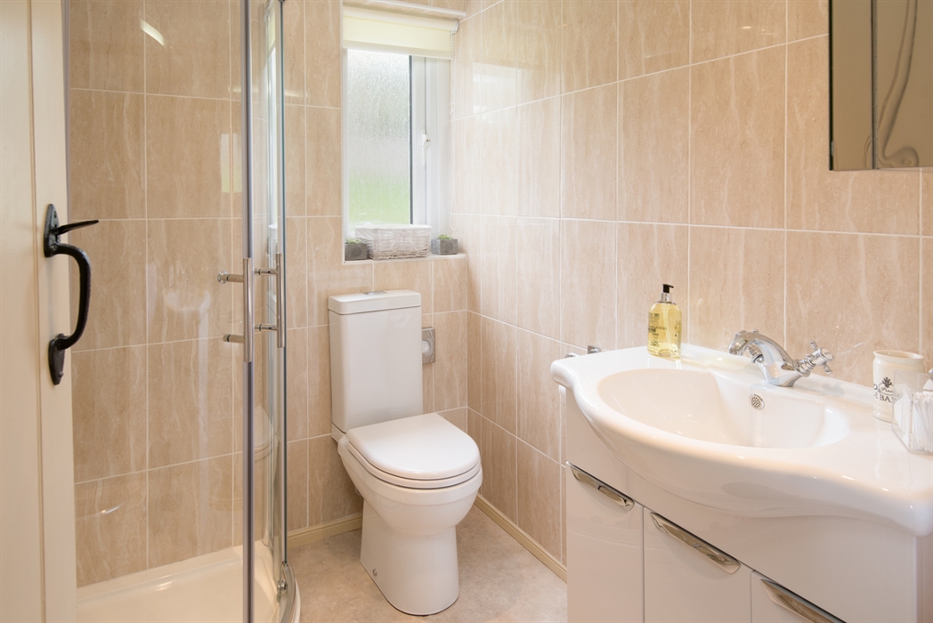 En-suite bathroom with corner shower unit, heated towel rail, basin and WC.
