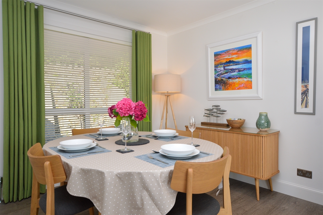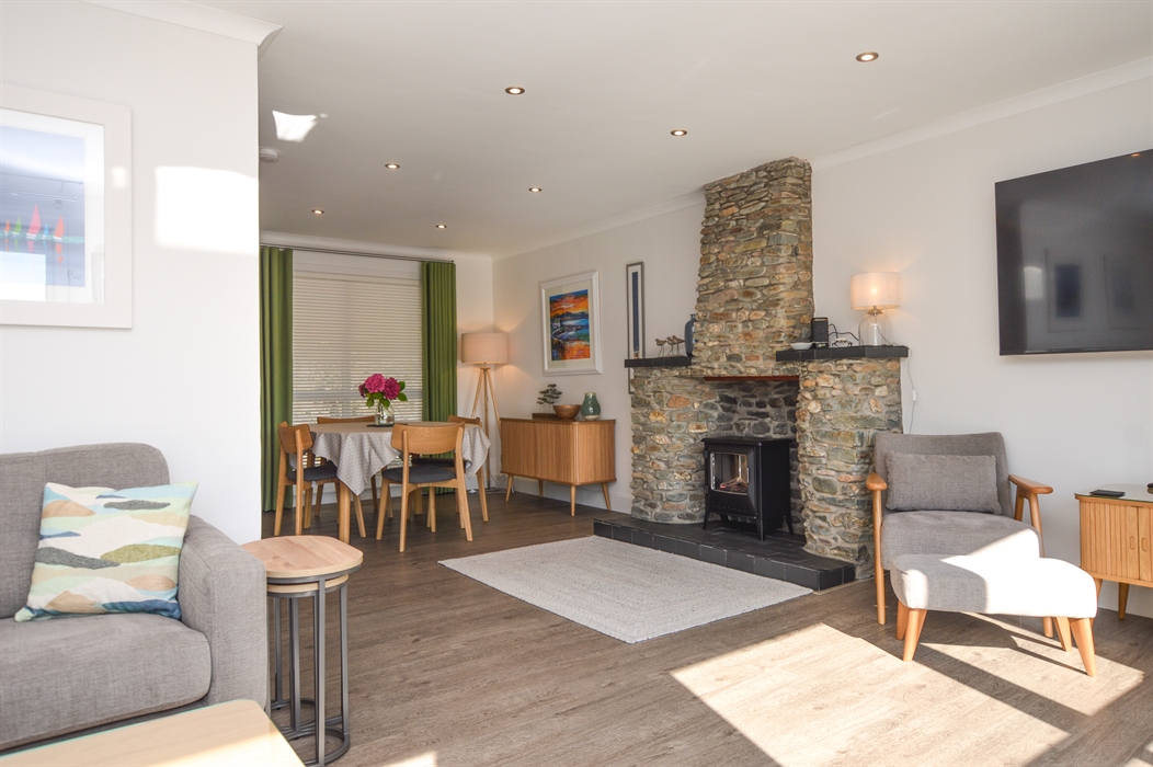Guests will enjoy a specious open plan living space, with a dining area and sitting room, featuring full length glass windows to enjoy the stunning sea views. A wonderful space for guests to settle in to after a day of exploring. Sink into the comfortable sofa and cosy up to watch the latest movie or simply enjoy the everchanging views.