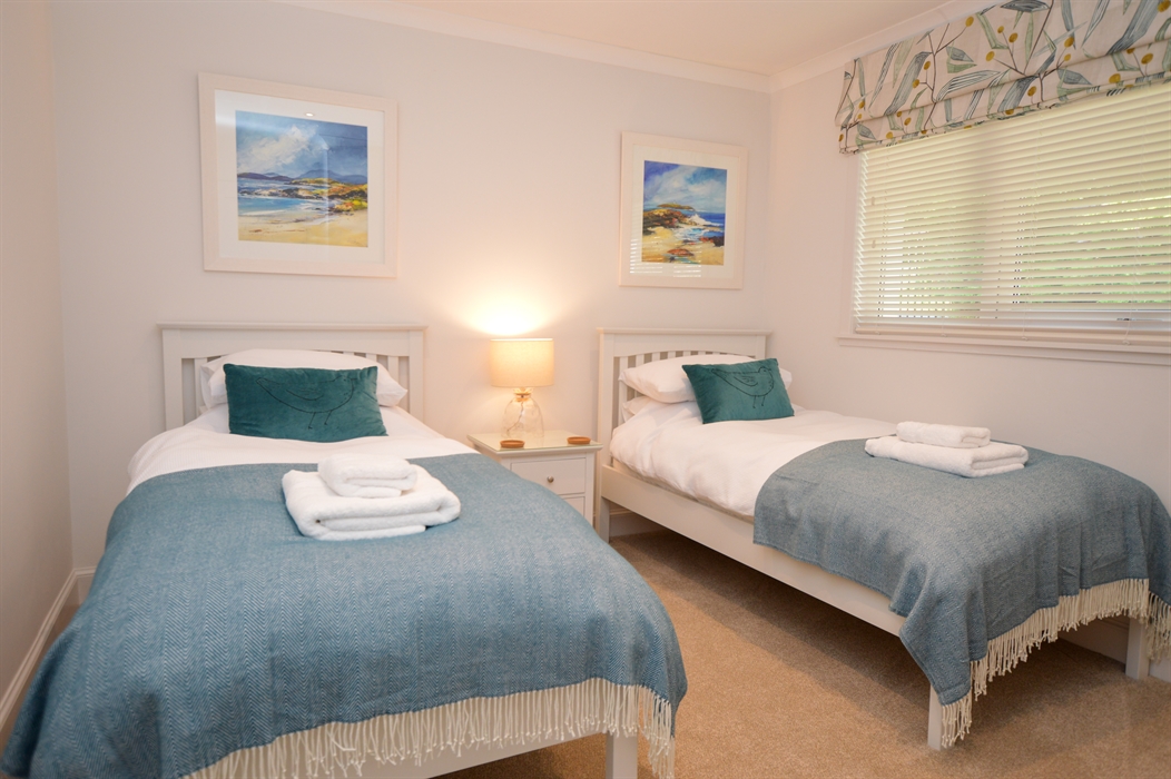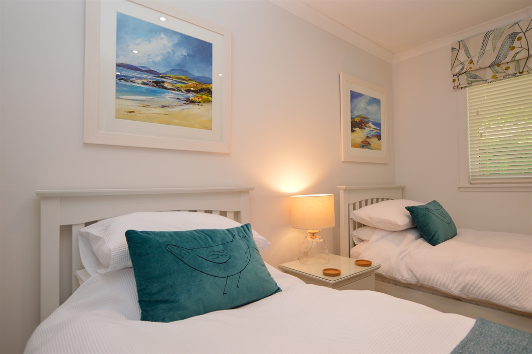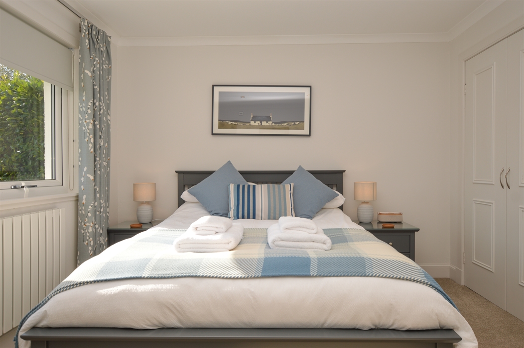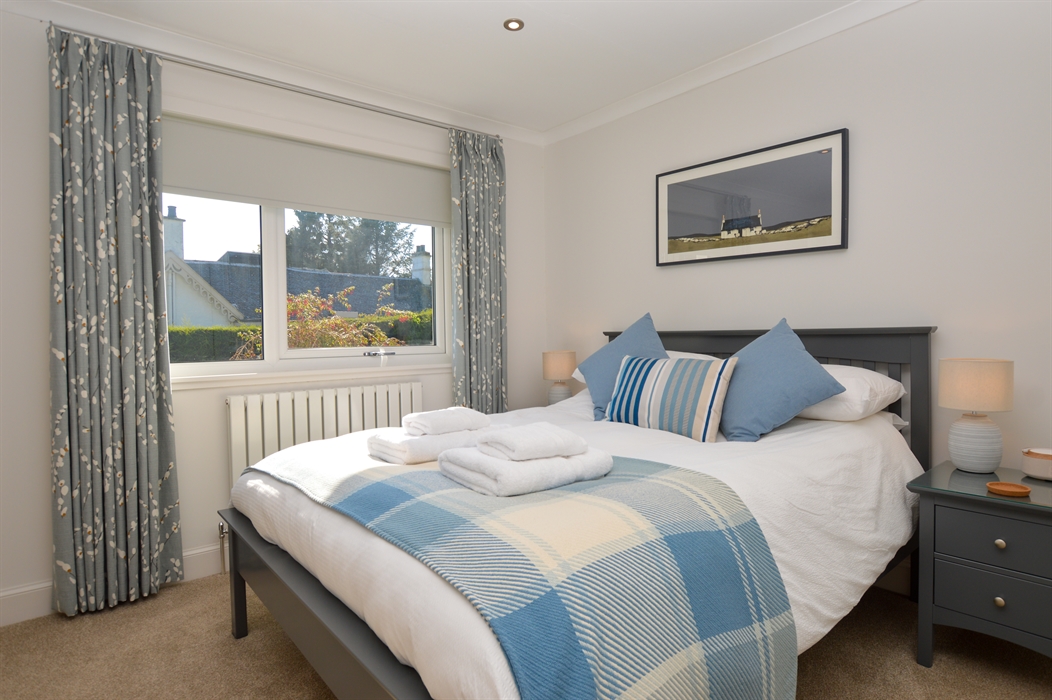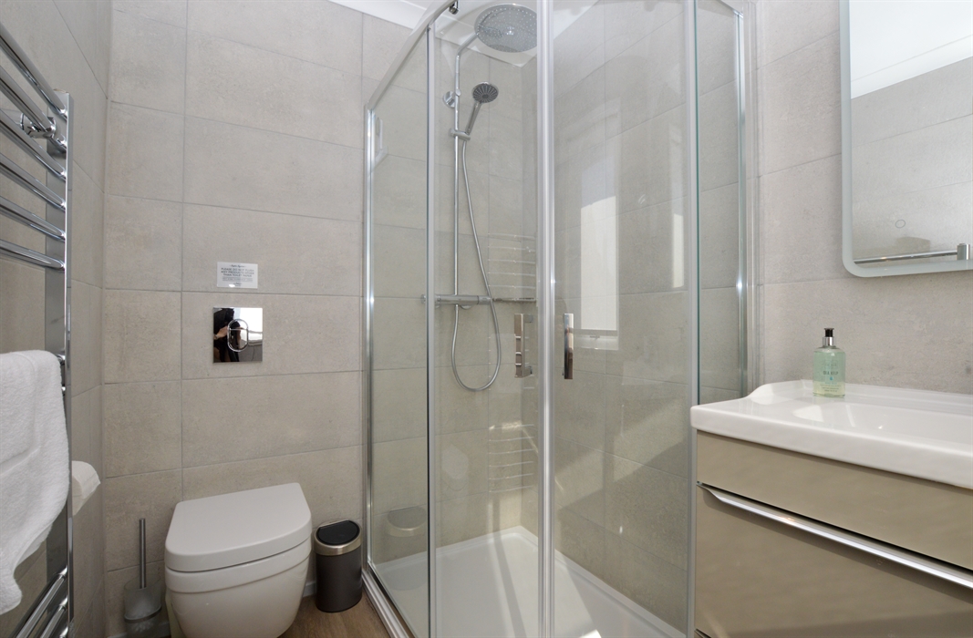 The spacious Master bedroom is beautifully appointed featuring a king bed, fitted wardrobes, and an ensuite bathroom. The second bedroom is a twin bedroom with two single beds. Adjacent, there is a new modern family bathroom with a walk-in shower.