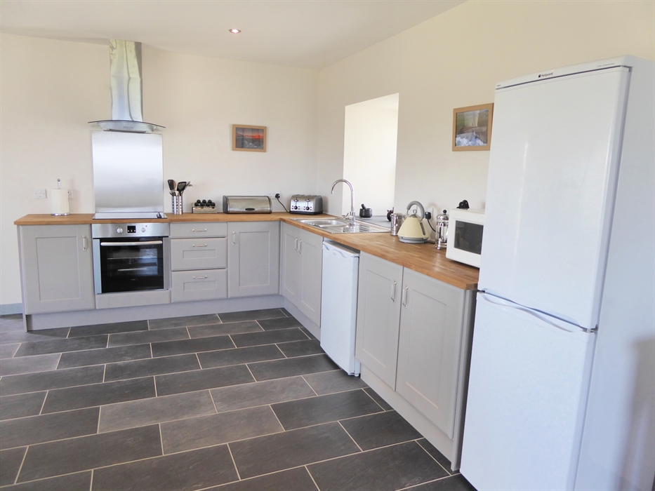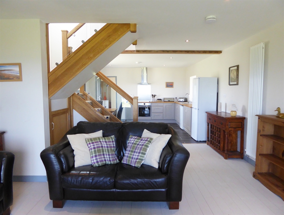 The main living accommodation is all open plan downstairs with a bright dining area set up by the window looking out over the surrounding open countryside towards the sea and at the other end of the room is the stylish and very well-equipped kitchen area.