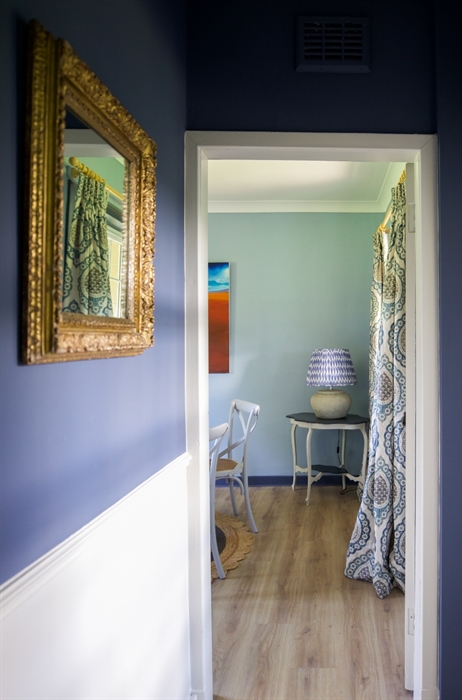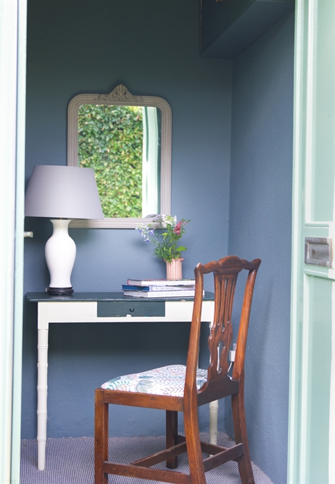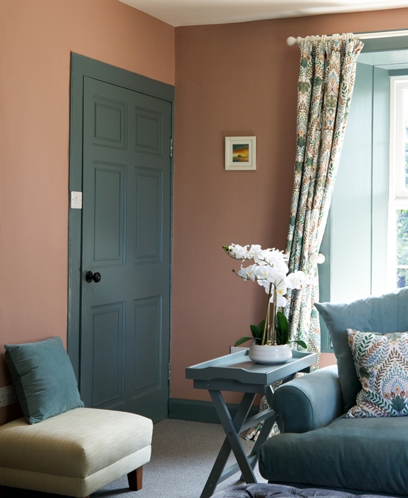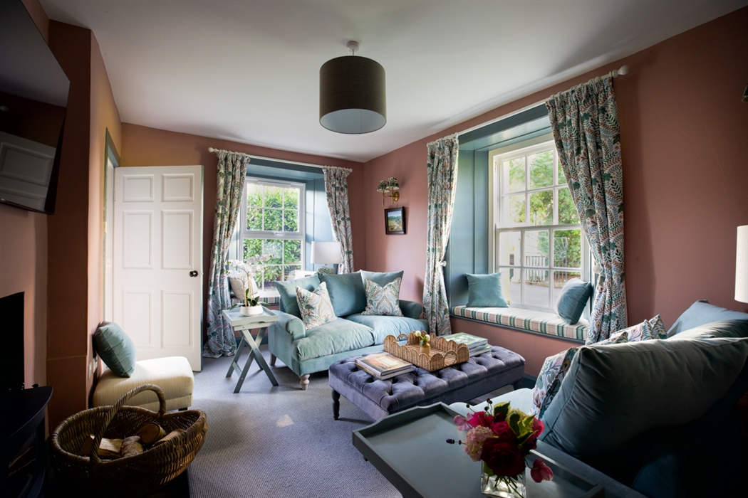 The dining room lies through a door in the kitchen, where a round table and atmospheric lighting create the perfect space to gather for meals. Back through the kitchen, you’ll find an inner hallway which leads to the bedrooms and sitting room. With it sulking-room-pink walls, plump blue furnishings, and wistful seats set beneath the Georgian sash windows, the sitting room is cosy and bright in equal measure – as inviting when bathed in sunlight as it when warmed by the log burner.