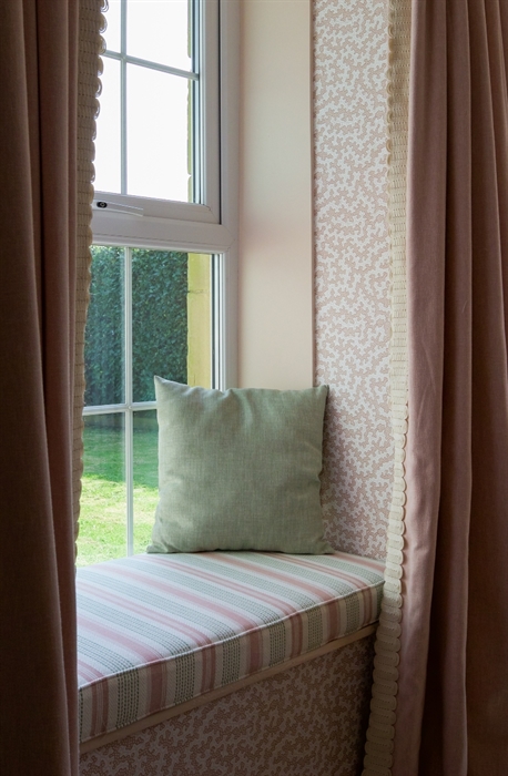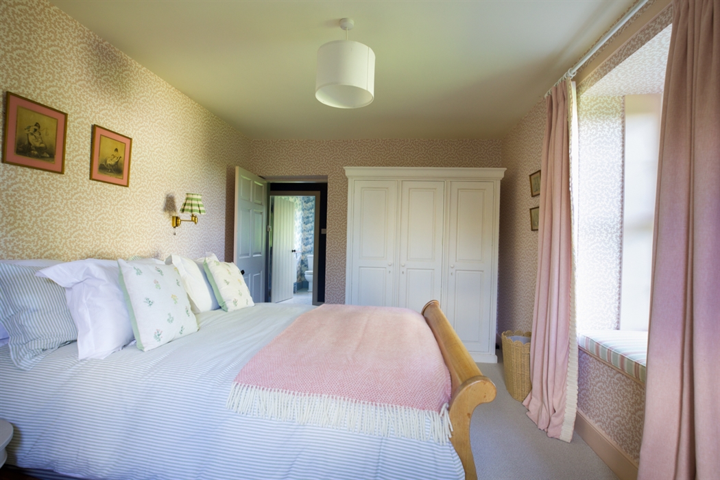 Bedroom one with king size sleigh bed, side tables, wardrobe with hanging space and storage, dressing table, armchair, double aspect windows with window seats looking onto the garden.