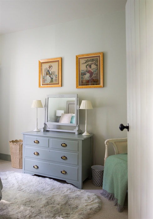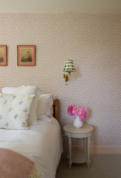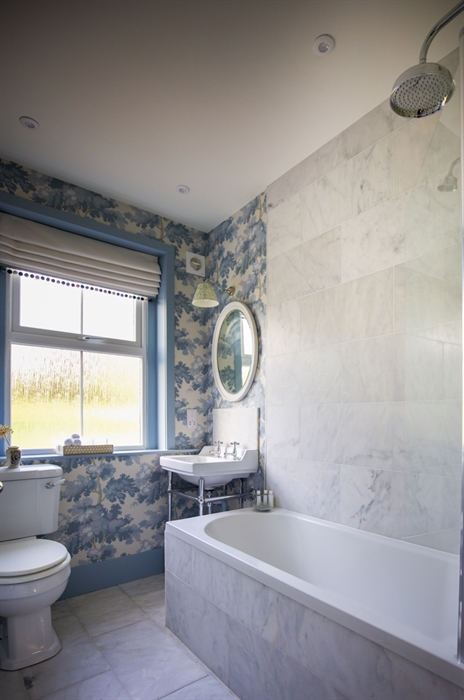 The first bedroom features a king size sleigh bed, topped with crisp white sheets and surrounded by whimsical pink floral wallpaper and Pooky sconces. As in the sitting room, dual-aspect sash windows fill the room with light and connect the room to the gardens beyond – the window seats and comfy armchair serving as the perfect spots to ease into the morning. The second bedroom is decorated a colour palette of soft blues, greens, and creams, and boasts a king size zip-and-link bed which can also be configured as twins. Both bedrooms are served by a family bathroom, where blue floral wallpaper encompasses a bath with a rainforest shower overhead.