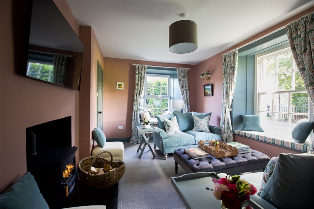 Sitting room with two double sofas, double aspect windows with window seats, two fireside stools or footstools, wall-mounted Smart TV, wood burning stove.