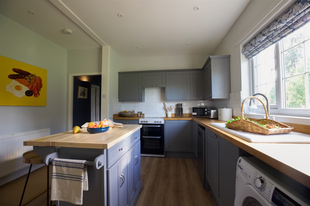 Kitchen with electric oven and four burner hob, full size dishwasher, fridge/freezer (3 drawer), washer/dryer, microwave, Nespresso Virtuo coffee machine and milk frother. Small central island with three breakfast stools.