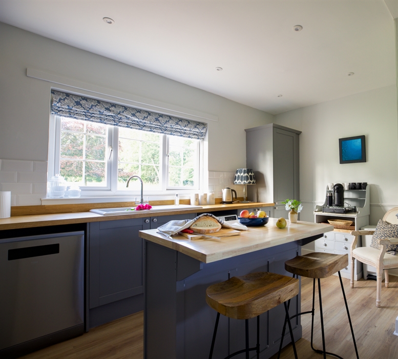 Original artworks reflect this artistic legacy at every turn in East Lodge, from delicate Victorian watercolours to vibrant contemporary oils. After a wander in the grounds, enter the cottage into the small hallway, where you’ll be met with a bench for removing your boots, a hanging rail for drying your coats, and landscapes hanging on midnight-blue walls. Off the hallway, the contemporary kitchen with wooden countertops, cool grey cabinets, and seating at an island is a welcoming space to unwind with a cup of tea, or perhaps a coffee made at the Nespresso machine’s dedicated station.